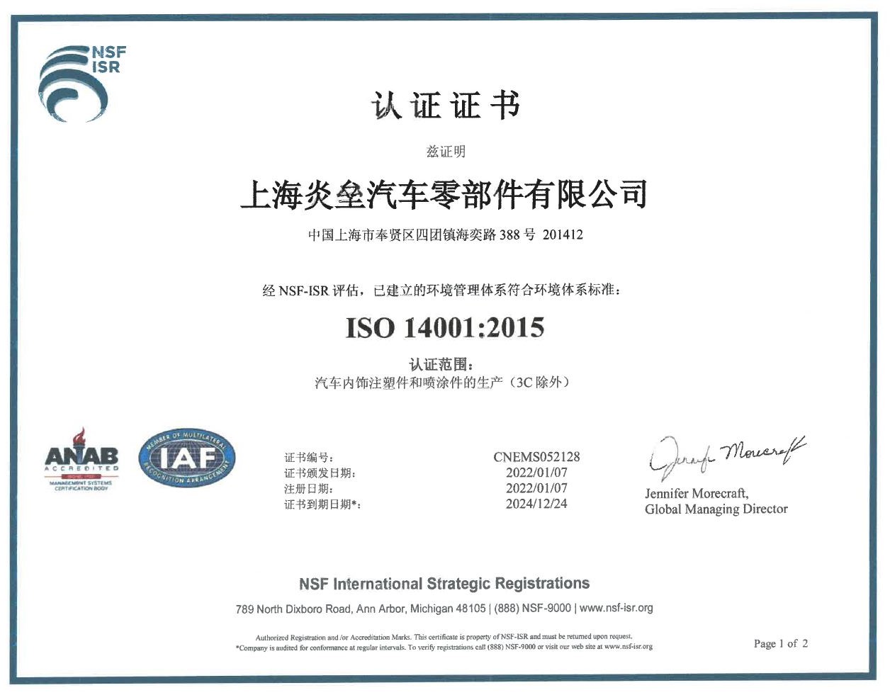 2018年12月份獲得了環境ISO 14001認證證書